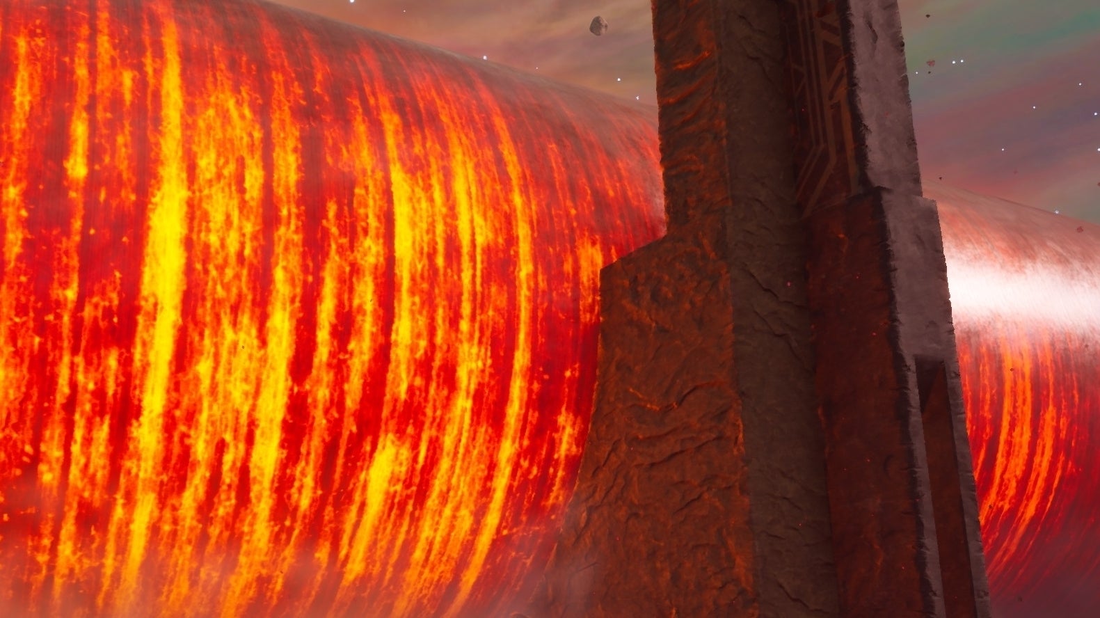 It’s a game by Chilean developer Ace Team, which burst onto the scene with the strikingly surreal Zeno Clash in 2009 (and then Rock of Ages after). Remember that? The Eternal Cylinder is so similar! It’s a kaleidoscopically colourful and bizarre world full of huge creatures a bit like snails and insects, and some I just have no idea what they’re supposed to be. But here they are, in a world of big stone towers and beams of light, and strange planets in the background. And dominating everything: a terrifyingly massive metal cylinder that moves.